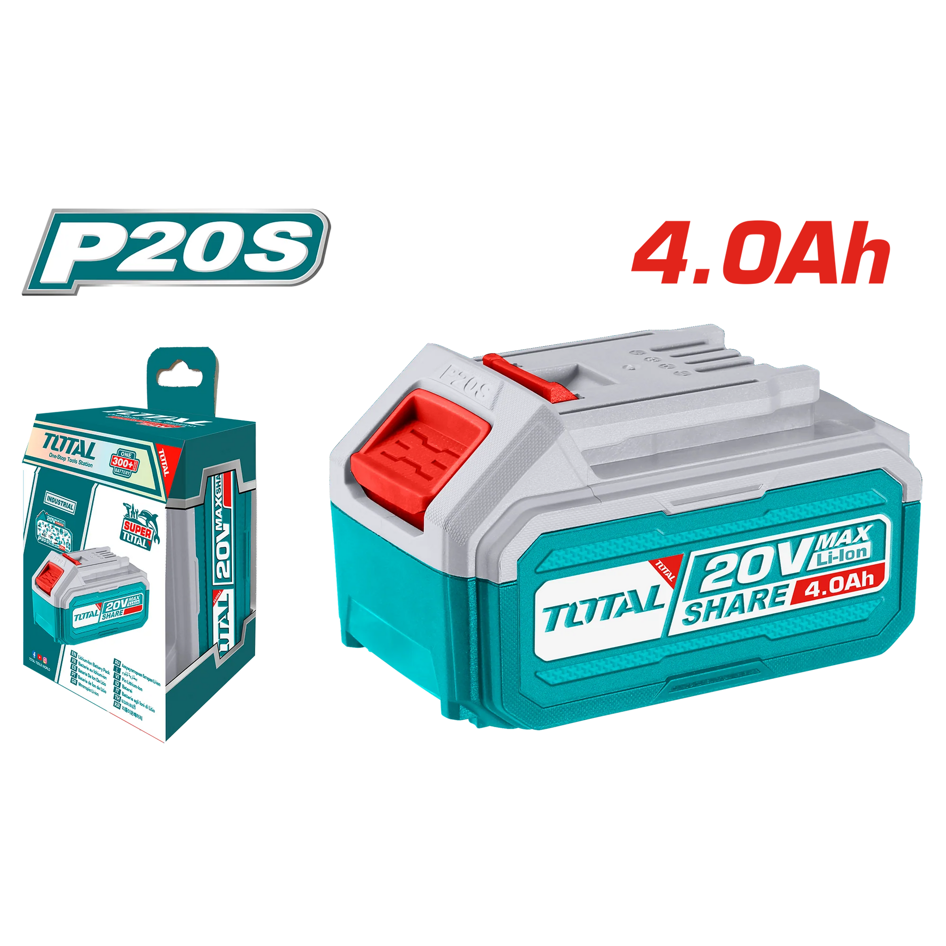 Professional Total P20S 20V Lithium-ion battery and charger kit designed for Total cordless power tools. Complete kit includes 2 rechargeable 4.0Ah batteries and 1 fast charger for uninterrupted work on job sites.